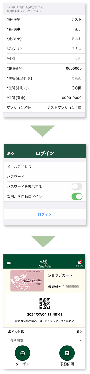 ご登録の電話番号とバーコード番号でログインいただくと、ご登録済み情報がアプリに表示されます。
