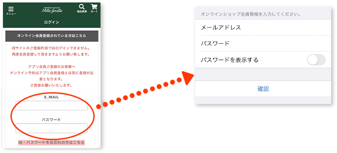 当店のオンラインショップにログインする際のメールアドレスとパスワードを入力してください。